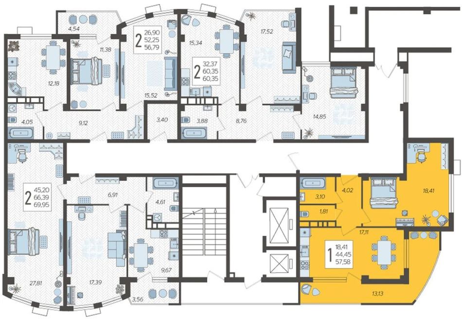 | 1-комн. | 40 - 58 м² | 7,2 - 8,2 млн ₽ |