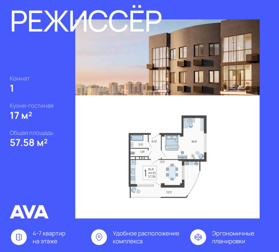 1-комнатная — 57,58 м² 10/14 эт. в Режиссёр