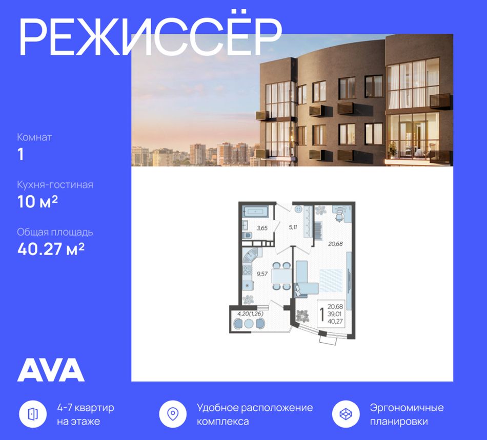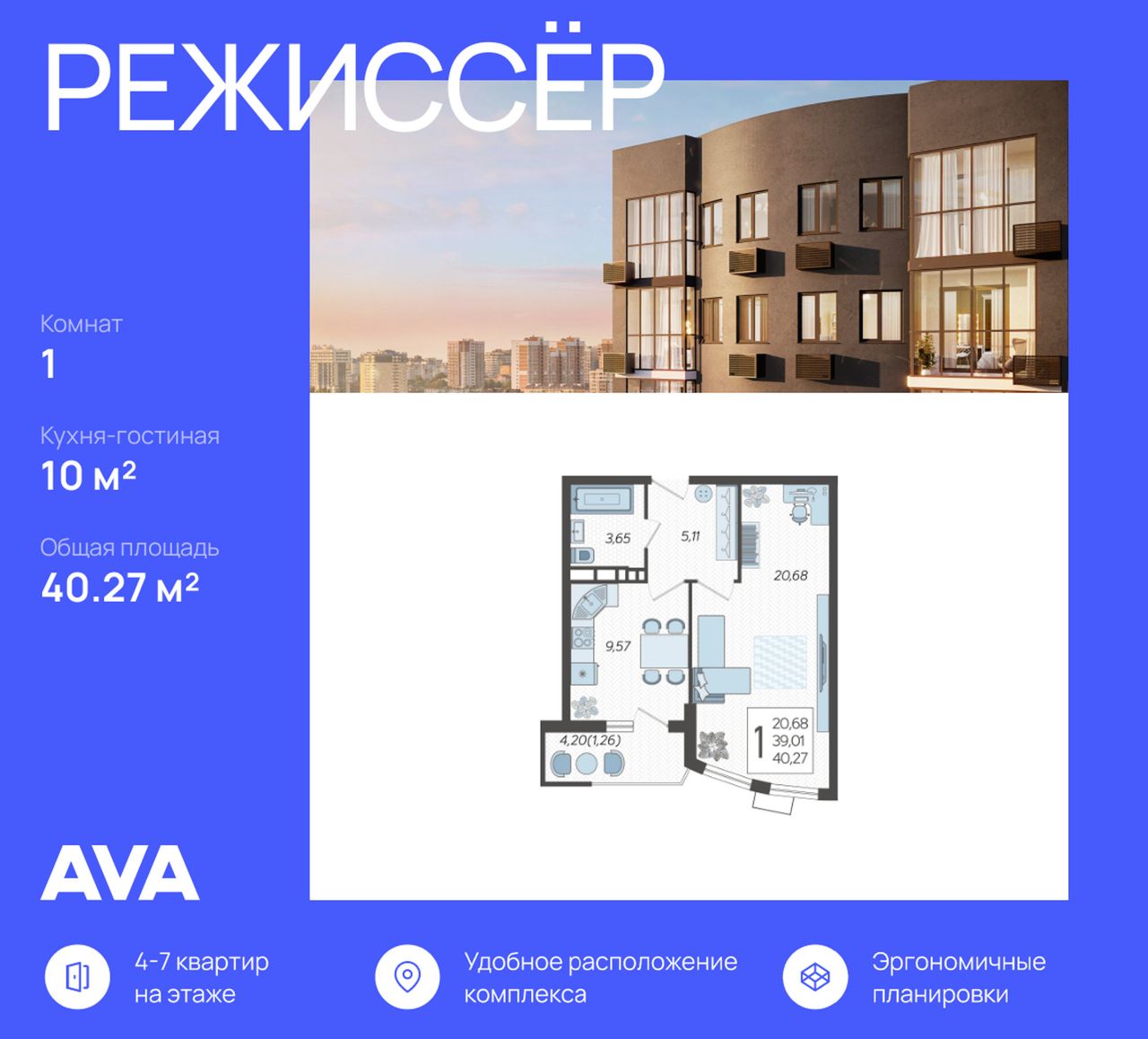 1-комнатная — 40,27 м² 20/21 эт. в Режиссёр