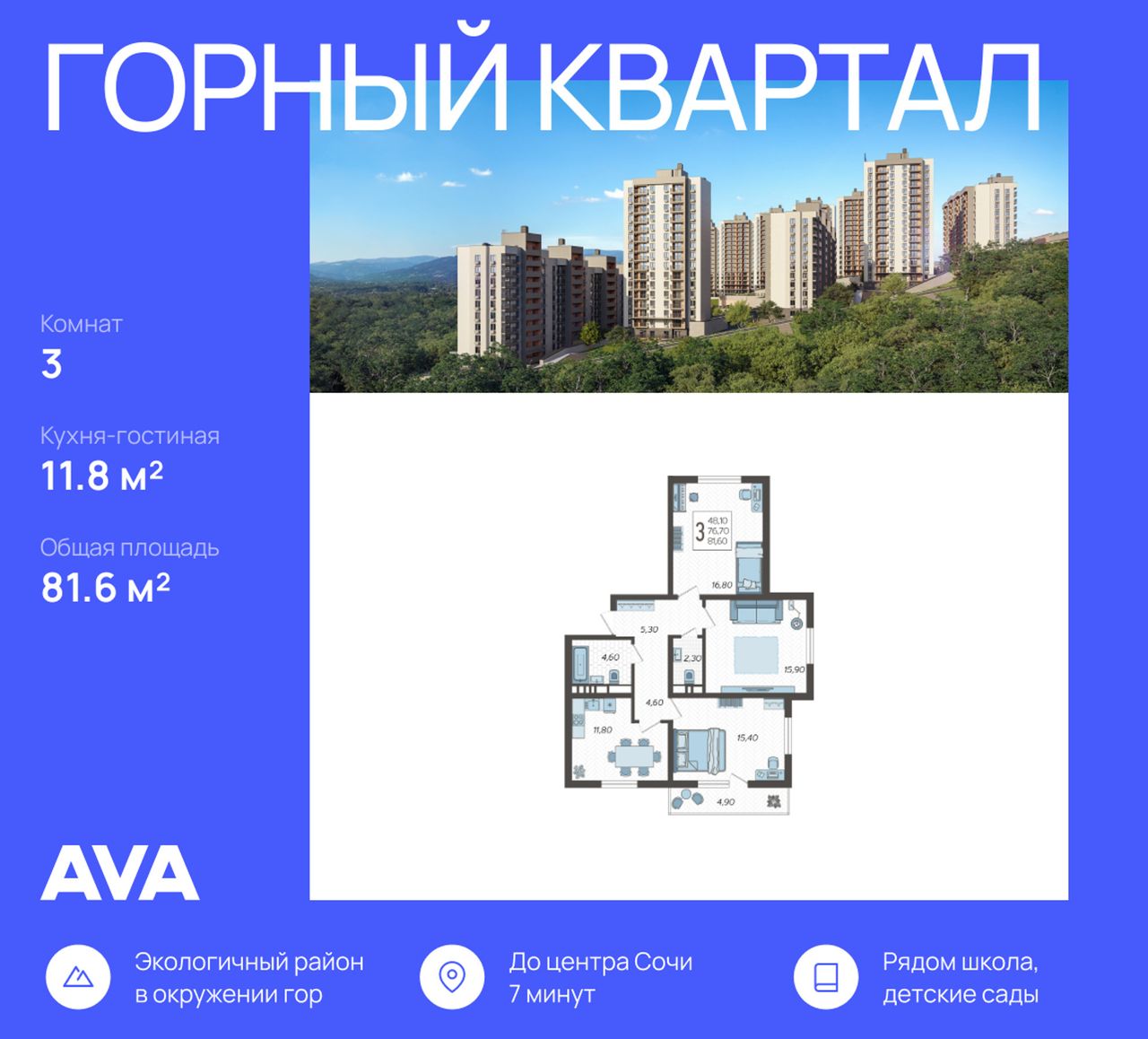 Продается 3-комнатная квартира в доме (Литер 2), срок сдачи : 3 кв. 2026, общей площадью 81.6 кв.м., на 4 этаже в новом современном жилом комплексе в Сочи «Горный квартал», Хостинский район. Отличный вариант для инвестиций и жизни.