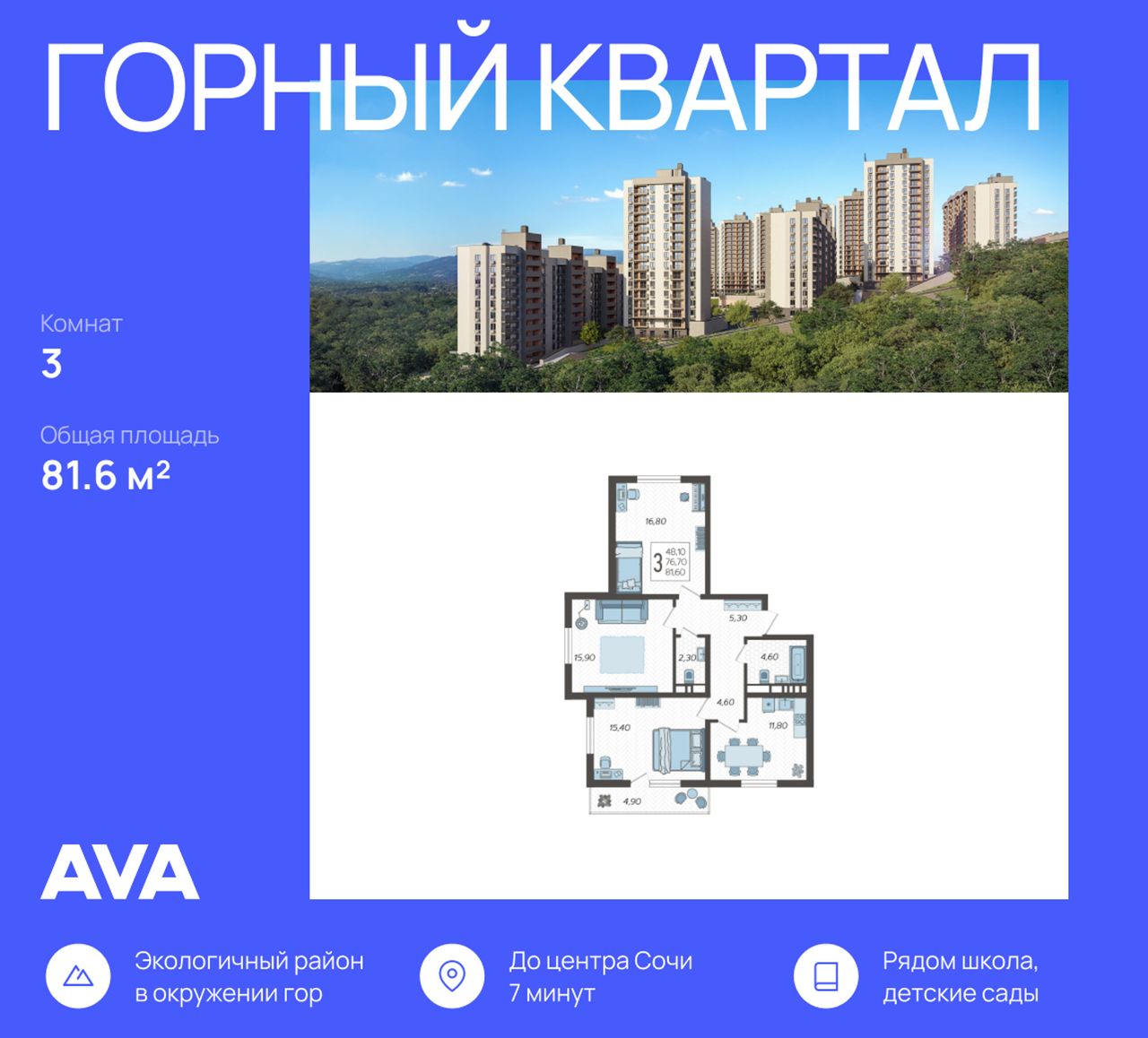 Продается 3-комнатная квартира в доме (Литер 2), срок сдачи : 3 кв. 2026, общей площадью 81.6 кв.м., на 5 этаже в новом современном жилом комплексе в Сочи «Горный квартал», Хостинский район. Отличный вариант для инвестиций и жизни.
