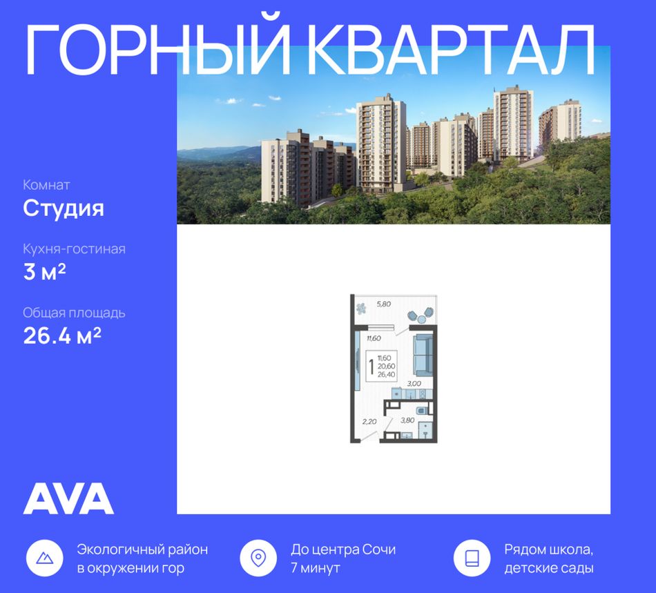 Продается студия в доме (Литер 3), срок сдачи : 3 кв. 2026, общей площадью 26.4 кв.м., на 8 этаже в новом современном жилом комплексе в Сочи «Горный квартал», Хостинский район. Отличный вариант для инвестиций и жизни.