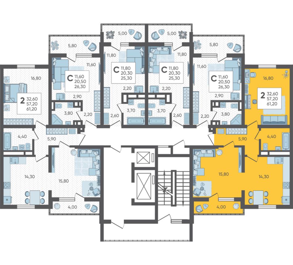 | 2-комн. | 61 м² | 8,7 - 8,8 млн ₽ |