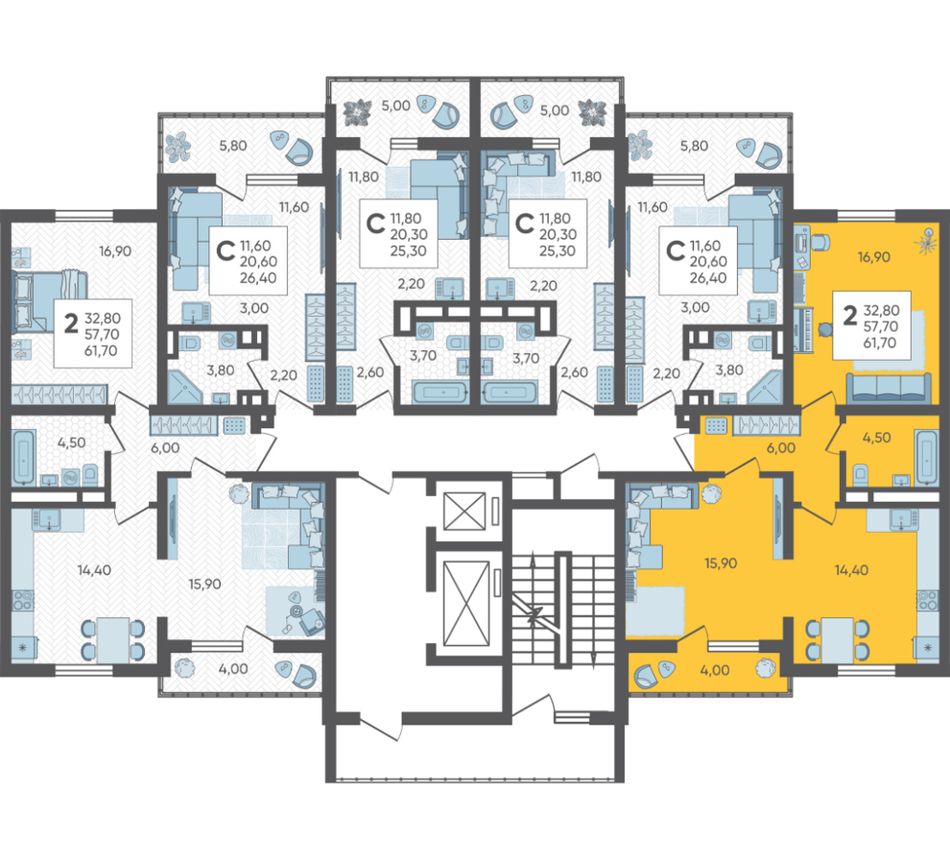 | 2-комн. | 61 м² | 8,7 - 8,8 млн ₽ |