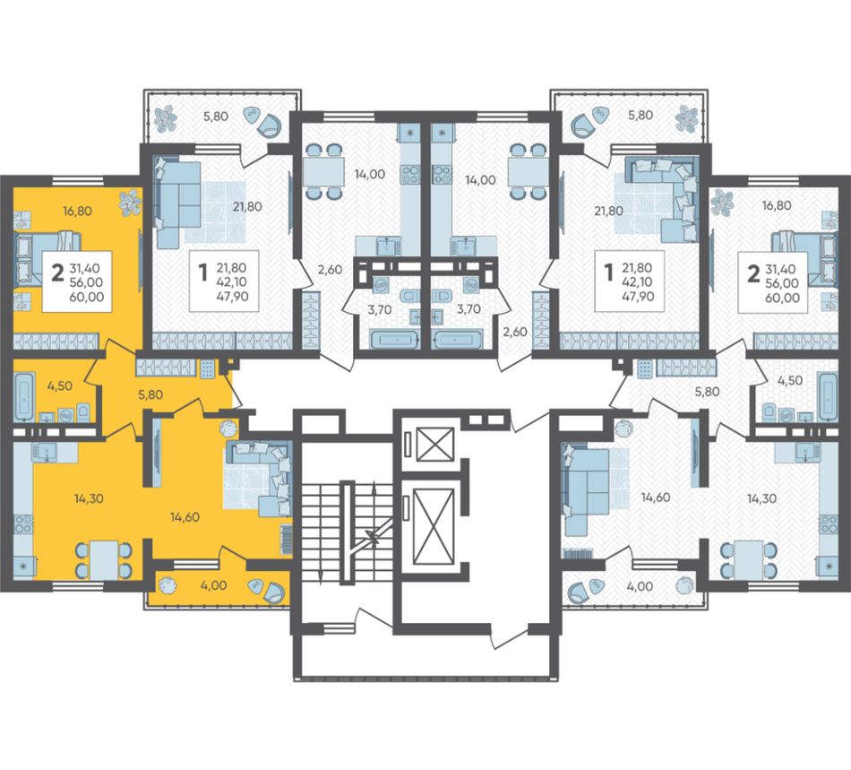 | 1-комн. | 40 - 58 м² | 7,2 - 8,1 млн ₽ |