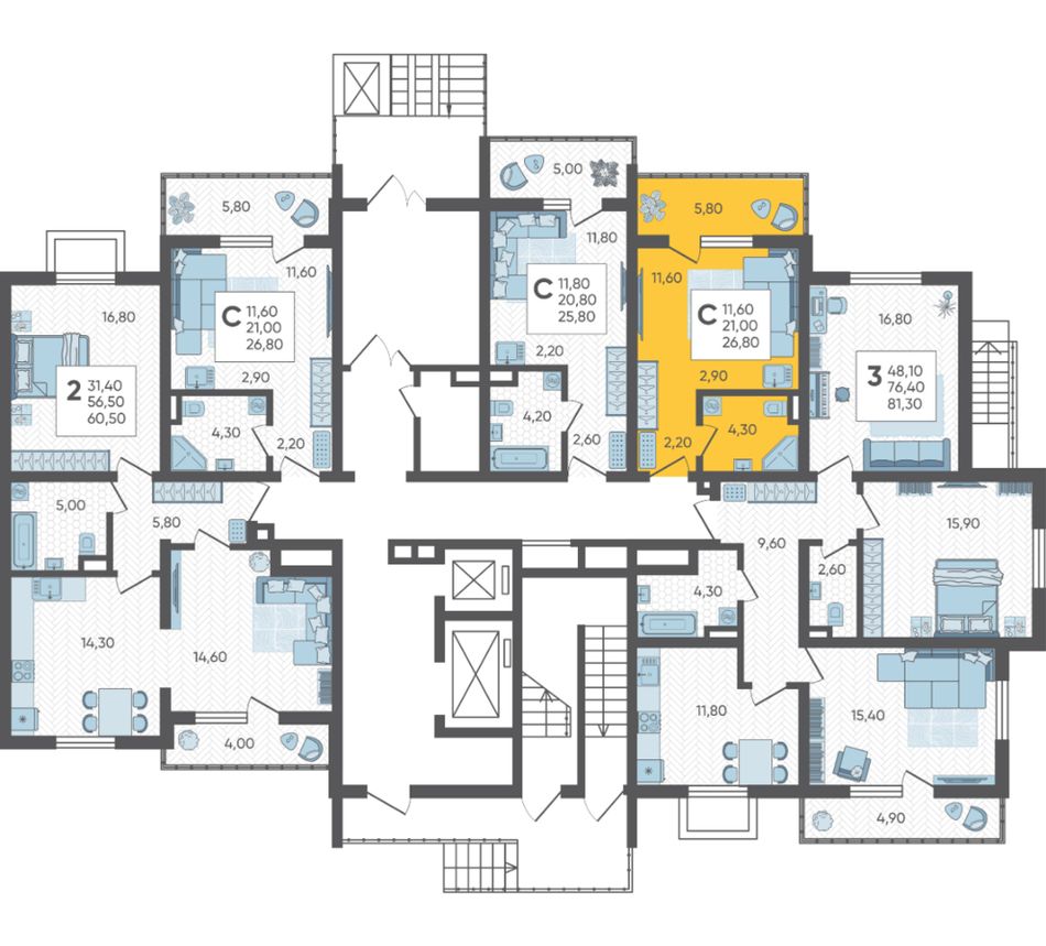| 3-комн. | 80 - 82 м² | 21,9 - 22,5 млн ₽ |