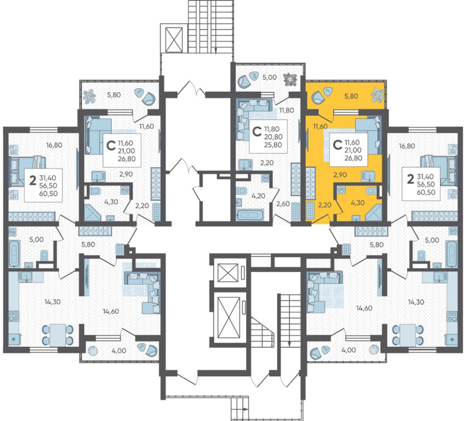 | 2-комн. | 61 - 68 м² | 8,7 - 9,6 млн ₽ |