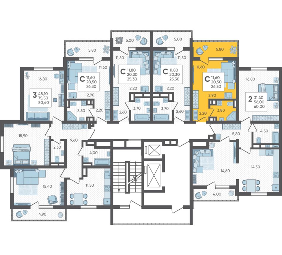 | 3-комн. | 78 - 79 м² | 8,8 - 9 млн ₽ |