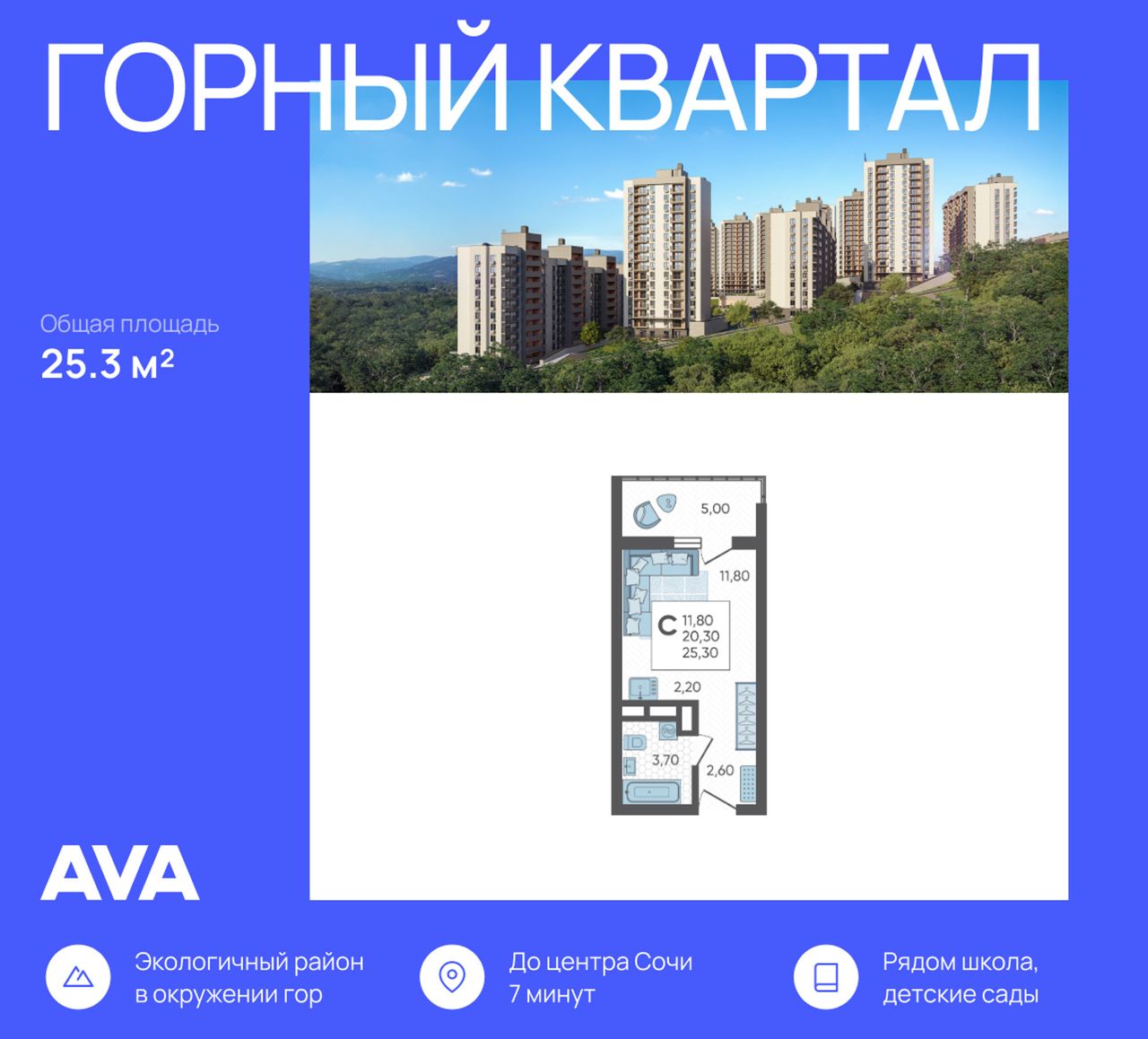 Продается студия в доме (Литер 4), срок сдачи : 3 кв. 2026, общей площадью 25.3 кв.м., на 16 этаже в новом современном жилом комплексе в Сочи «Горный квартал», Хостинский район. Отличный вариант для инвестиций и жизни.