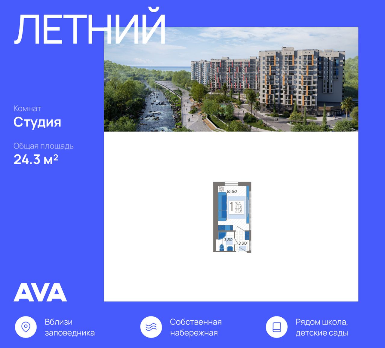 Жилой комплекс "Летний" расположен в ущелье реки Кудепста. В пешей минутной доступности – детские сады и школы. Удобный выезд к железнодорожному вокзалу и аэропорту. За 15 минут можно доехать до Олимпийского парка. ЖК “Летний” - это комплексная застройка из семи 12-этажных домов, который находится в долине реки Кудепста, с собственной набережной, видом из окон на море и горы, многоуровневым паркингом с эксплуатируемой кровлей, современными детскими и спортивными площадками. Рядом расположен заповедник, где берут начало туристические тропы на самые красивые водопады региона, единственная в России тисо-самшитовая роща.