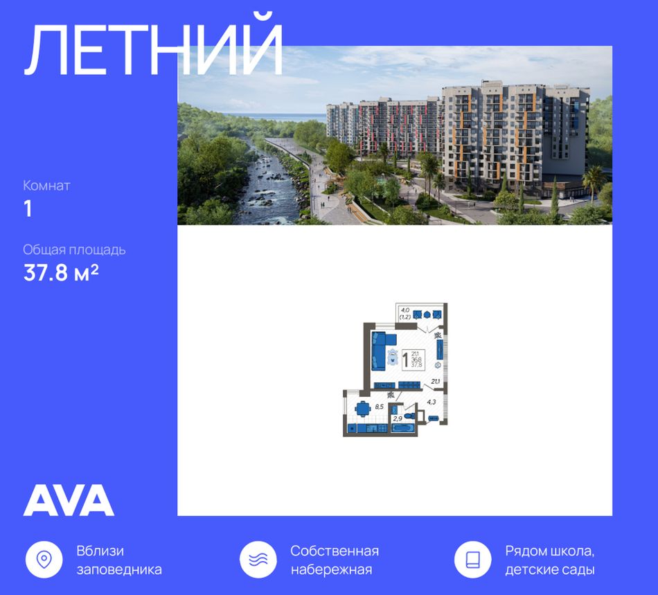 1-комнатная — 37,8 м² 7/12 эт. в Летний