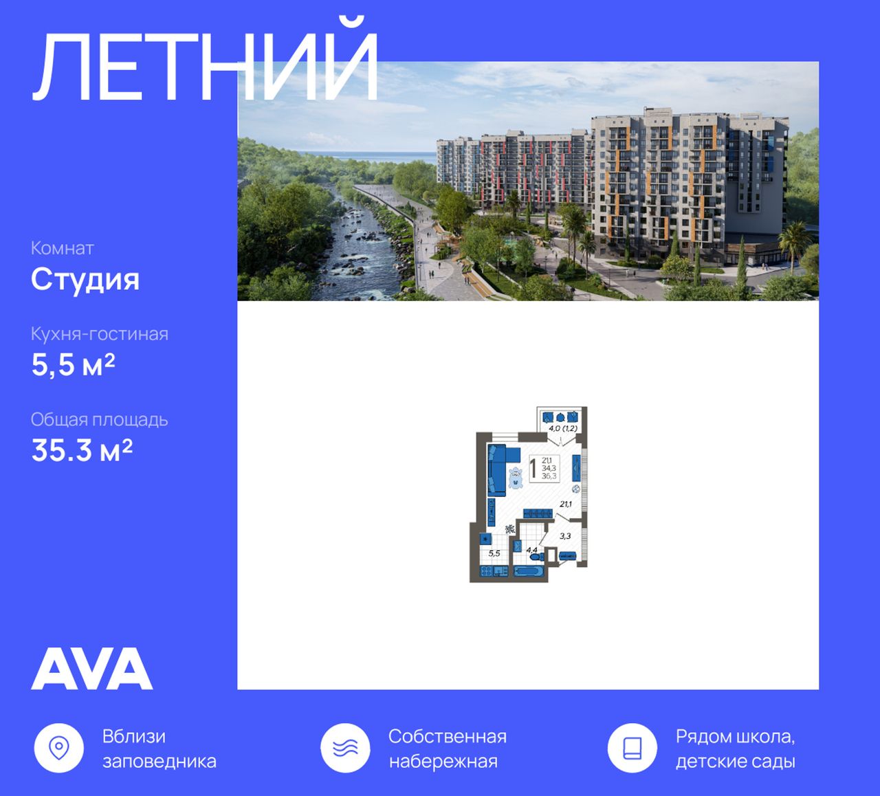 Жилой комплекс "Летний" расположен в ущелье реки Кудепста. В пешей минутной доступности – детские сады и школы. Удобный выезд к железнодорожному вокзалу и аэропорту. За 15 минут можно доехать до Олимпийского парка. ЖК “Летний” - это комплексная застройка из семи 12-этажных домов, который находится в долине реки Кудепста, с собственной набережной, видом из окон на море и горы, многоуровневым паркингом с эксплуатируемой кровлей, современными детскими и спортивными площадками. Рядом расположен заповедник, где берут начало туристические тропы на самые красивые водопады региона, единственная в России тисо-самшитовая роща.