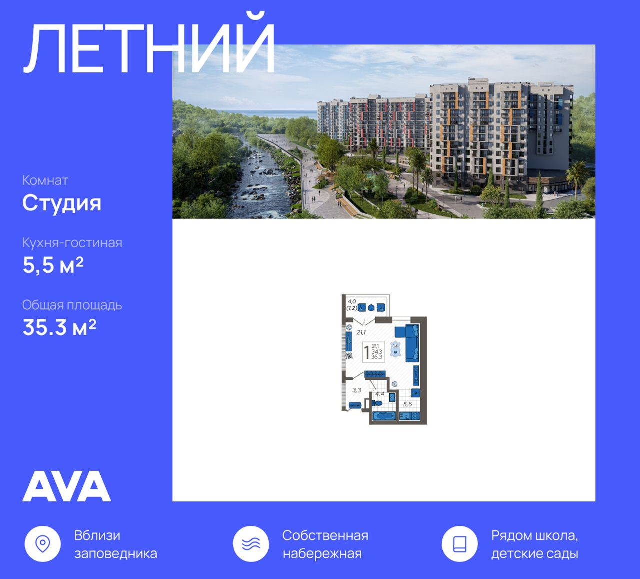 Жилой комплекс "Летний" расположен в ущелье реки Кудепста. В пешей минутной доступности – детские сады и школы. Удобный выезд к железнодорожному вокзалу и аэропорту. За 15 минут можно доехать до Олимпийского парка. ЖК “Летний” - это комплексная застройка из семи 12-этажных домов, который находится в долине реки Кудепста, с собственной набережной, видом из окон на море и горы, многоуровневым паркингом с эксплуатируемой кровлей, современными детскими и спортивными площадками. Рядом расположен заповедник, где берут начало туристические тропы на самые красивые водопады региона, единственная в России тисо-самшитовая роща.