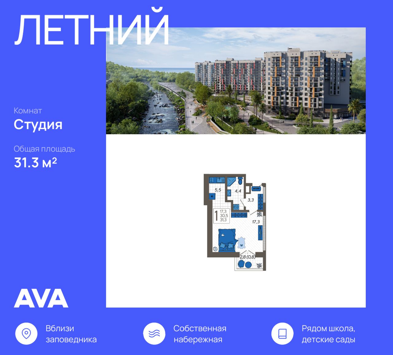 Жилой комплекс "Летний" расположен в ущелье реки Кудепста. В пешей минутной доступности – детские сады и школы. Удобный выезд к железнодорожному вокзалу и аэропорту. За 15 минут можно доехать до Олимпийского парка. ЖК “Летний” - это комплексная застройка из семи 12-этажных домов, который находится в долине реки Кудепста, с собственной набережной, видом из окон на море и горы, многоуровневым паркингом с эксплуатируемой кровлей, современными детскими и спортивными площадками. Рядом расположен заповедник, где берут начало туристические тропы на самые красивые водопады региона, единственная в России тисо-самшитовая роща.