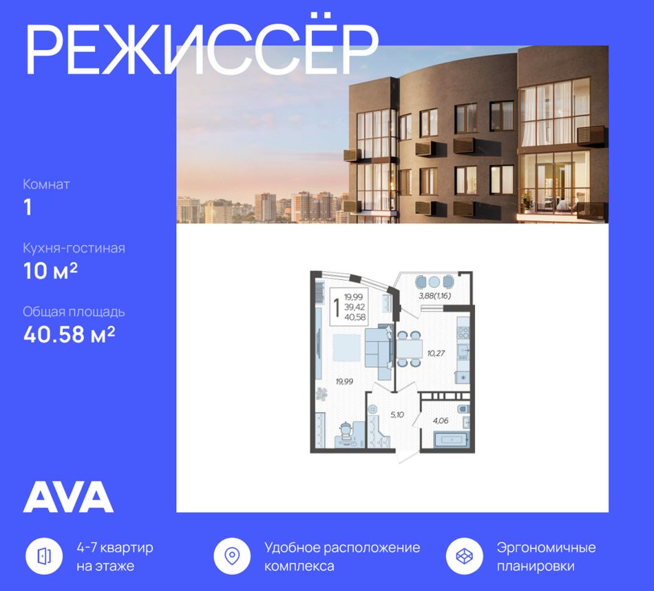 1-комнатная — 40,58 м² 20/21 эт. в Режиссёр