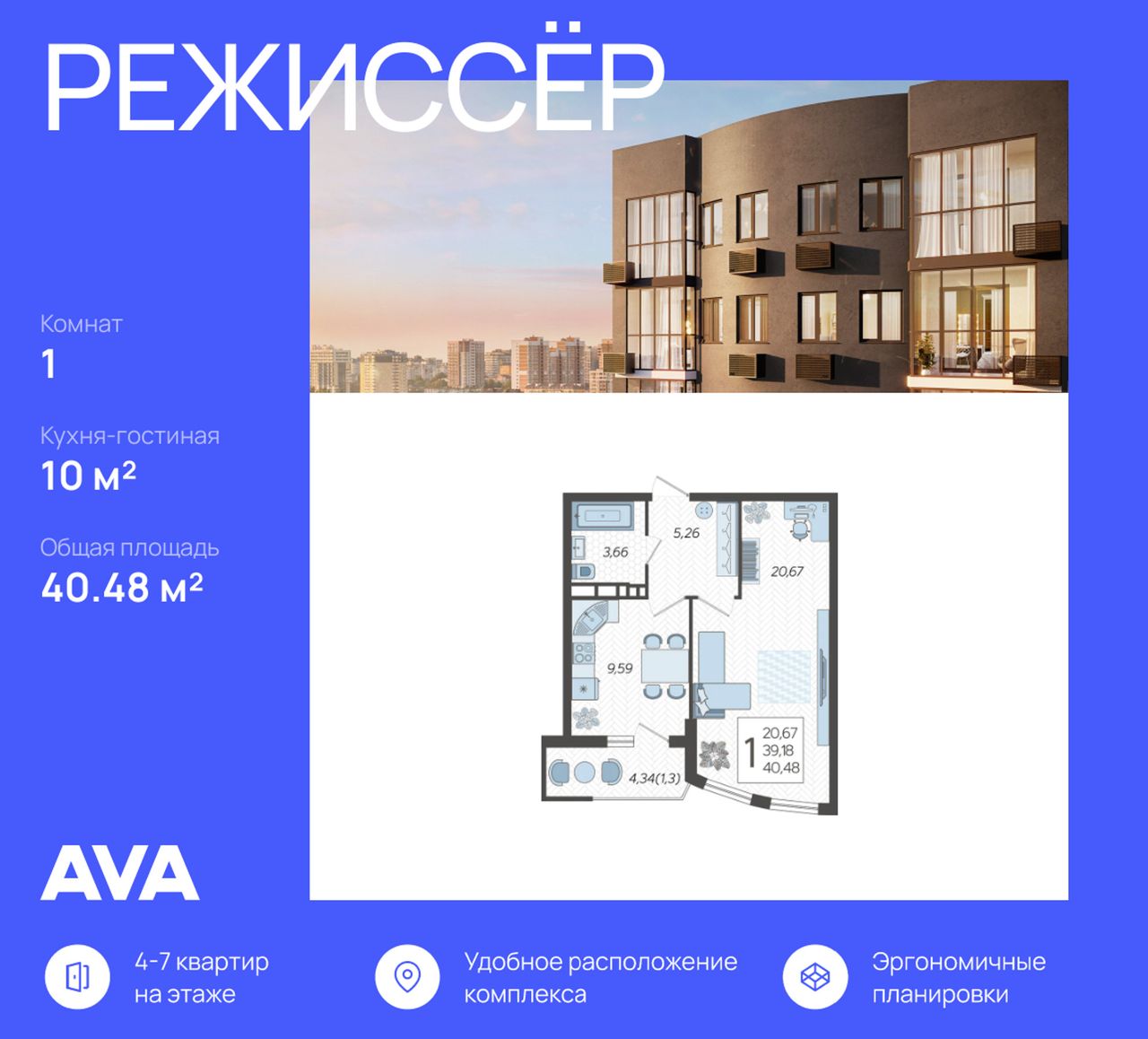 1-комнатная — 40,48 м² 21/21 эт. в Режиссёр
