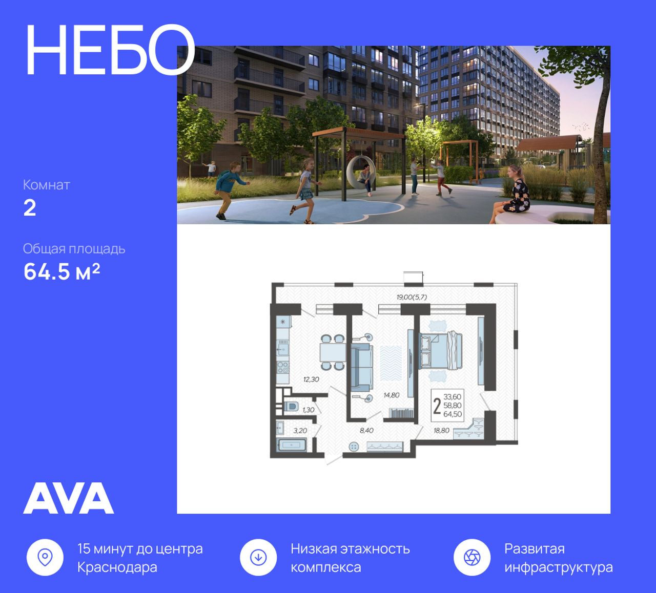 2-комнатная — 64,5 м² 7/12 эт. в Небо