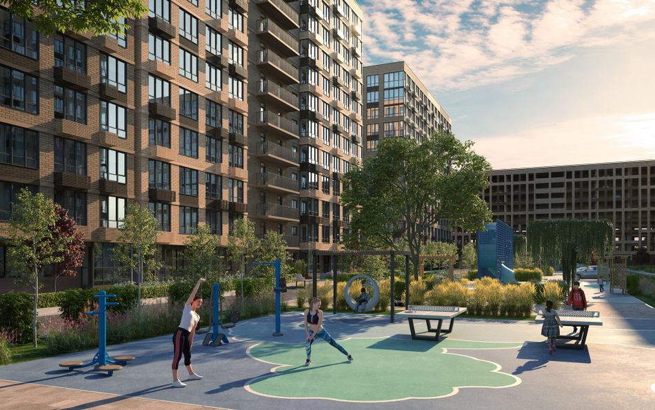 Яркие фасады с благоустроенной территорией, детские и спортивные площадки на стилобате, трехуровневый подземный паркинг и апарт-отель на тер...