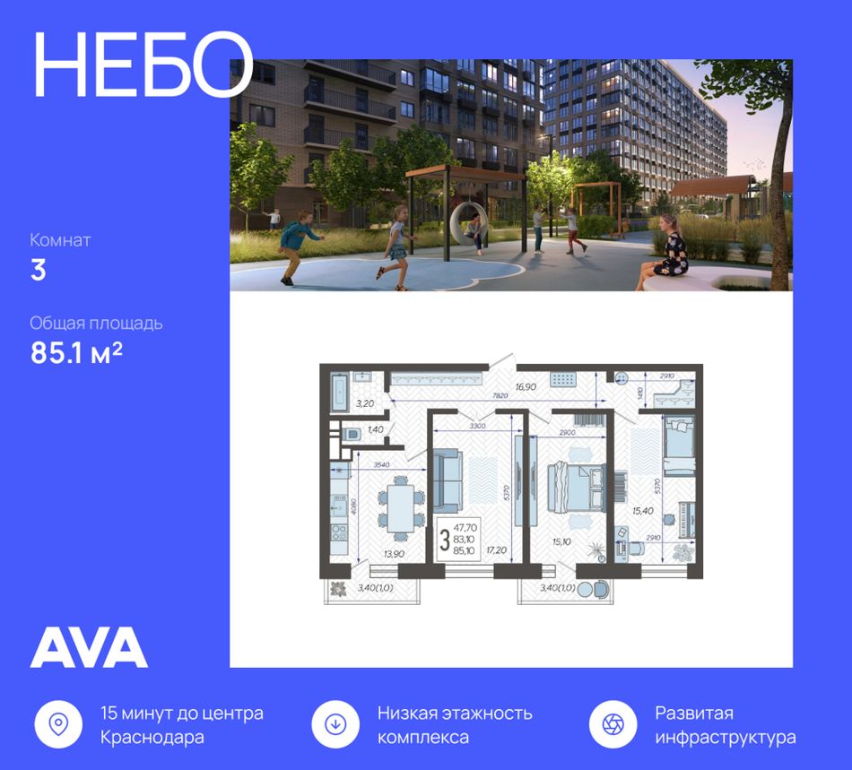3-комнатная — 85,1 м² 1/12 эт. в Небо