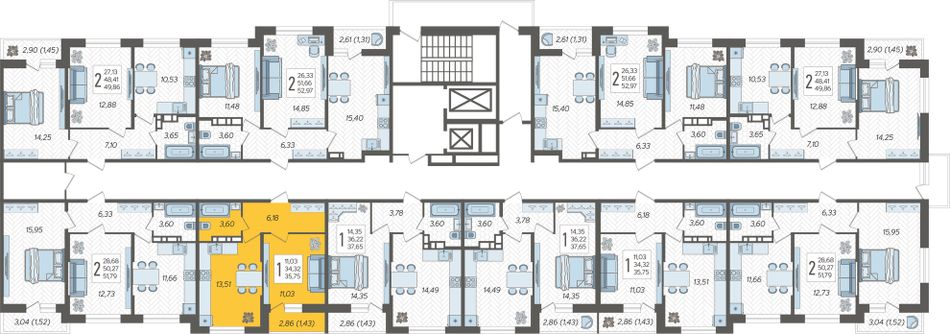 Продаётся 1-комнатная квартира №87 в ЖК «Смородина» (Корпус 18, Секция 1), на 9 этаже 12-этажного дома, срок сдачи: 2 кв. 2028, общей площадью 35,75 кв. м. Без отделки.