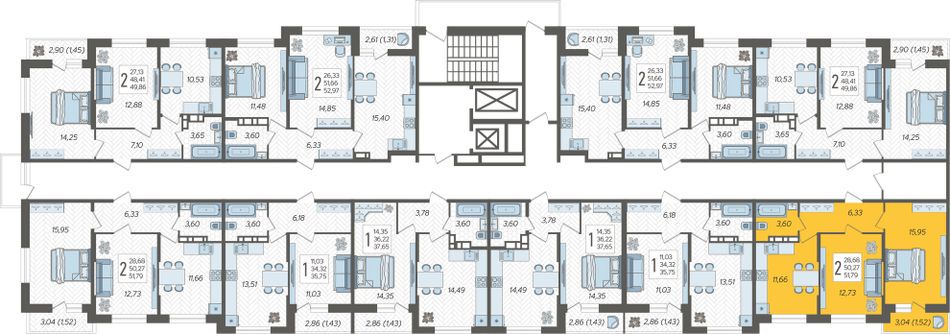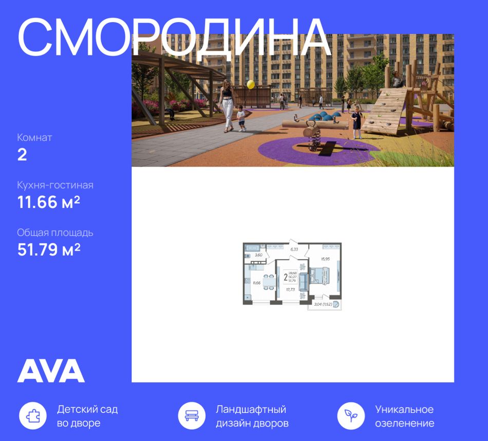 2-комнатная — 51,79 м² 3/12 эт. в Смородина