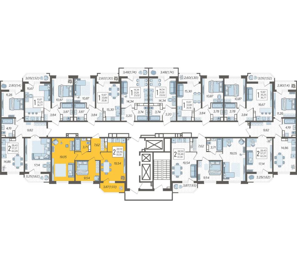 | 2-комн. | 61 м² | 8,7 - 8,8 млн ₽ |