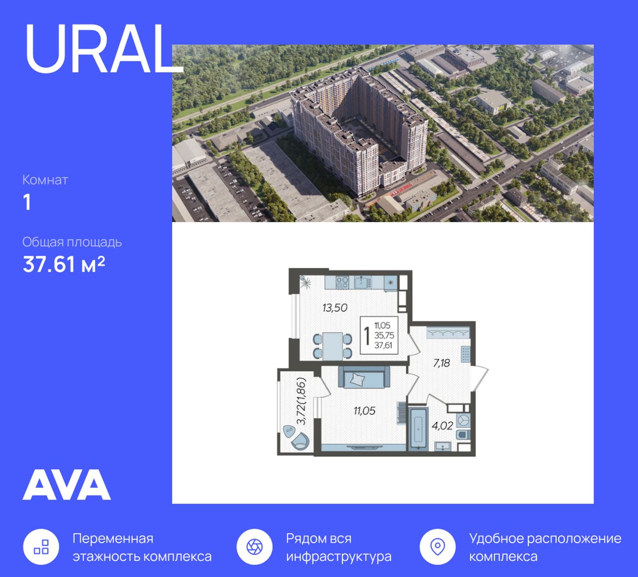 1-комнатная — 37,61 м² 16/23 эт. в URAL (Урал)