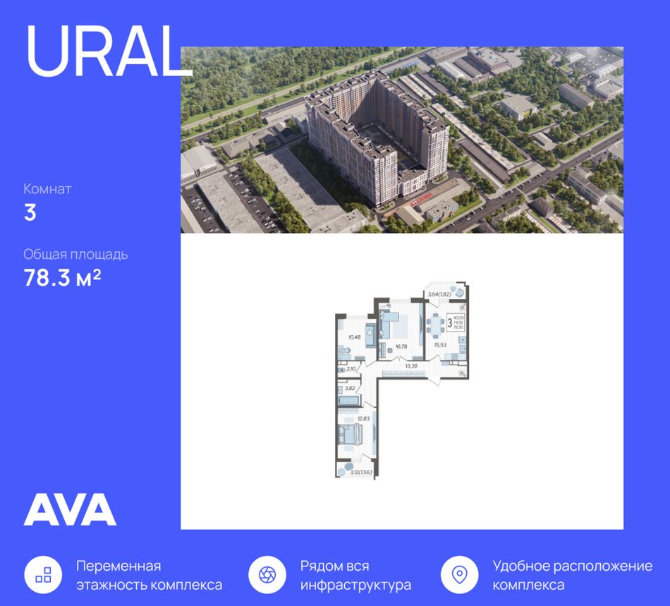 3-комнатная — 78,3 м² 9/23 эт. в URAL (Урал)