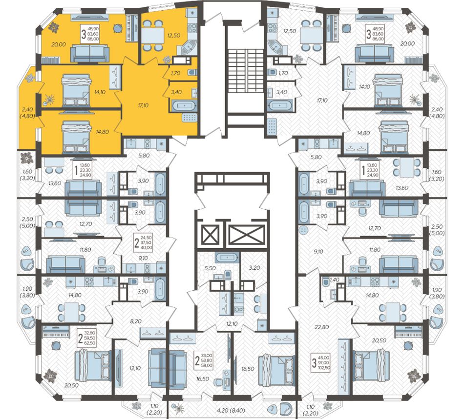 | 3-комн. | 86 - 111 м² | 10 - 13,2 млн ₽ |