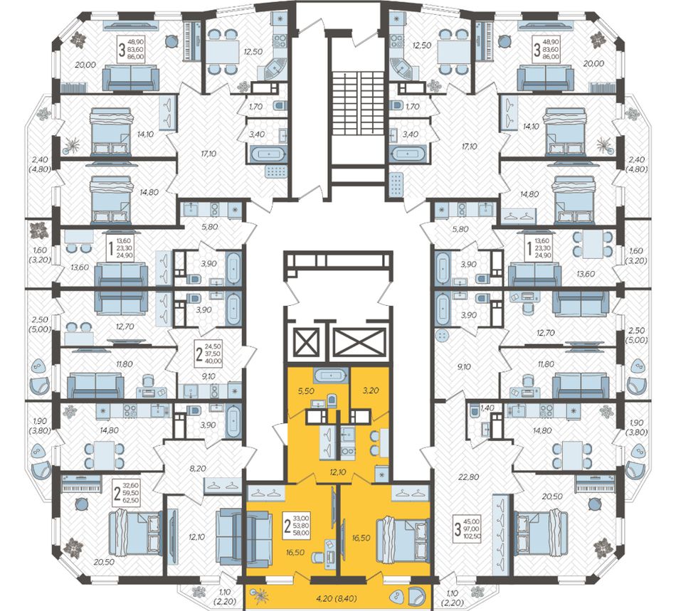 | 1-комн. | 40 - 58 м² | 7,2 - 7,9 млн ₽ |