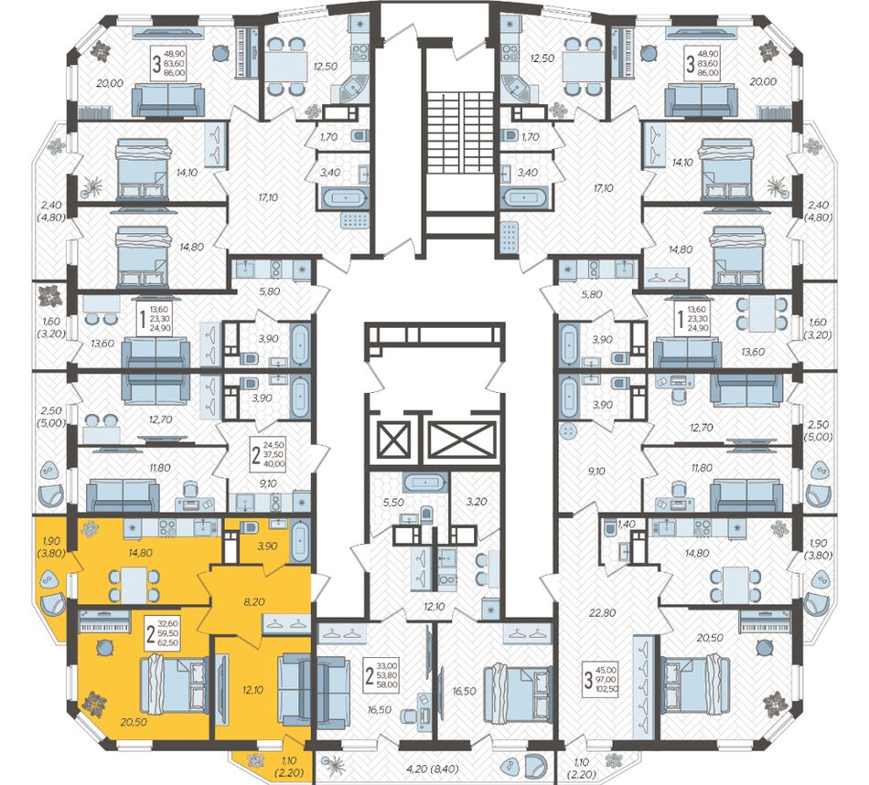 | 2-комн. | 60 - 68 м² | 8,4 - 9,6 млн ₽ |