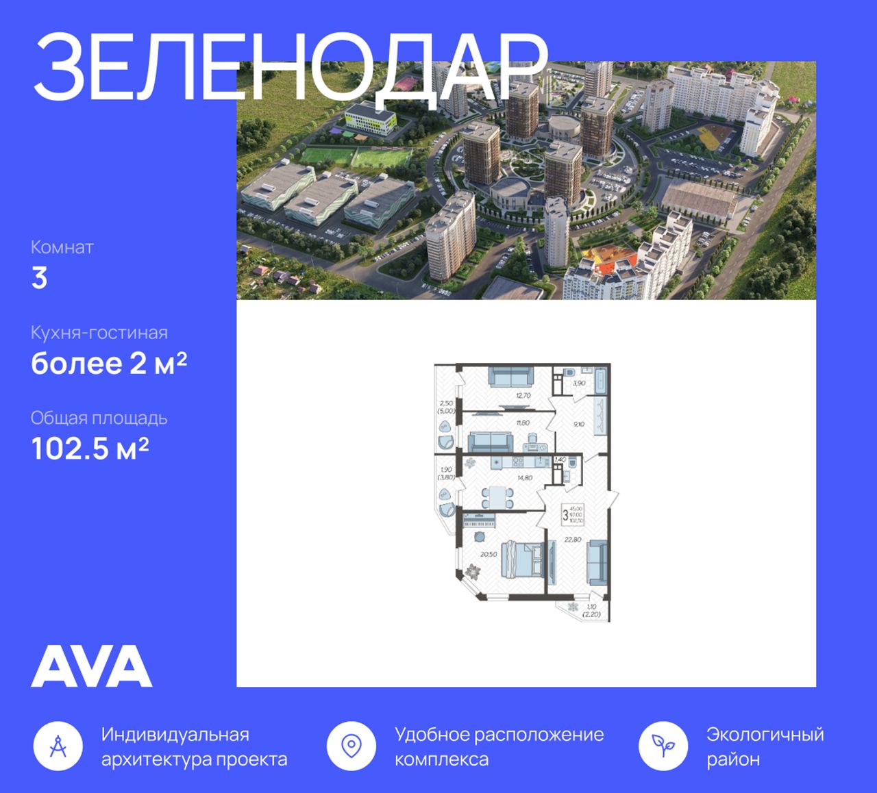 3-комнатная — 102,5 м² 15/16 эт. в Зеленодар