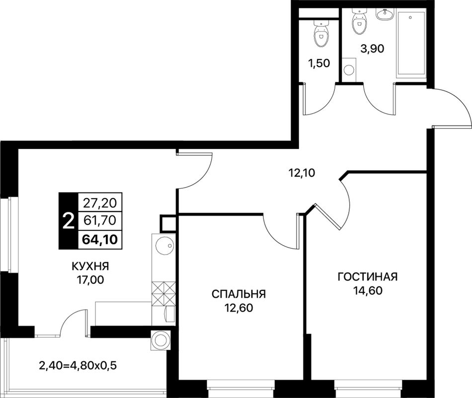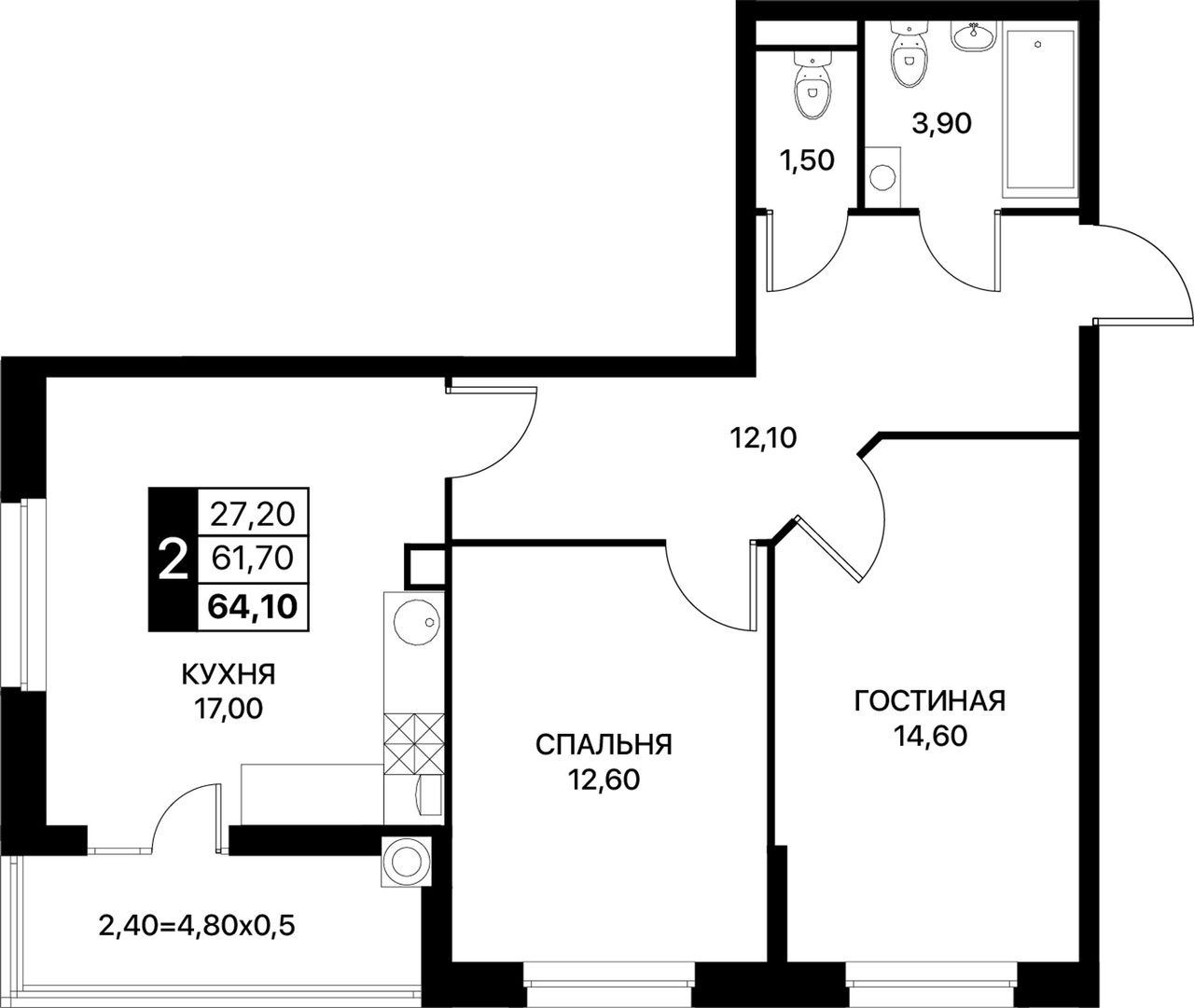 2-комнатная — 64,1 м² 2/12 эт. в Smartpolét (Смартполёт, Полет)