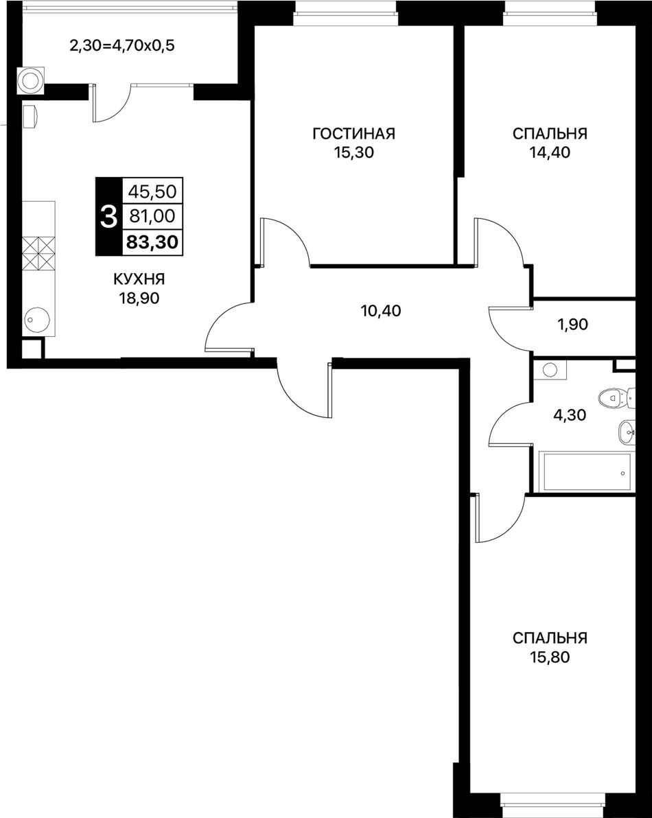 3-комнатная — 83,3 м² 2/12 эт. в Smartpolét (Смартполёт, Полет)