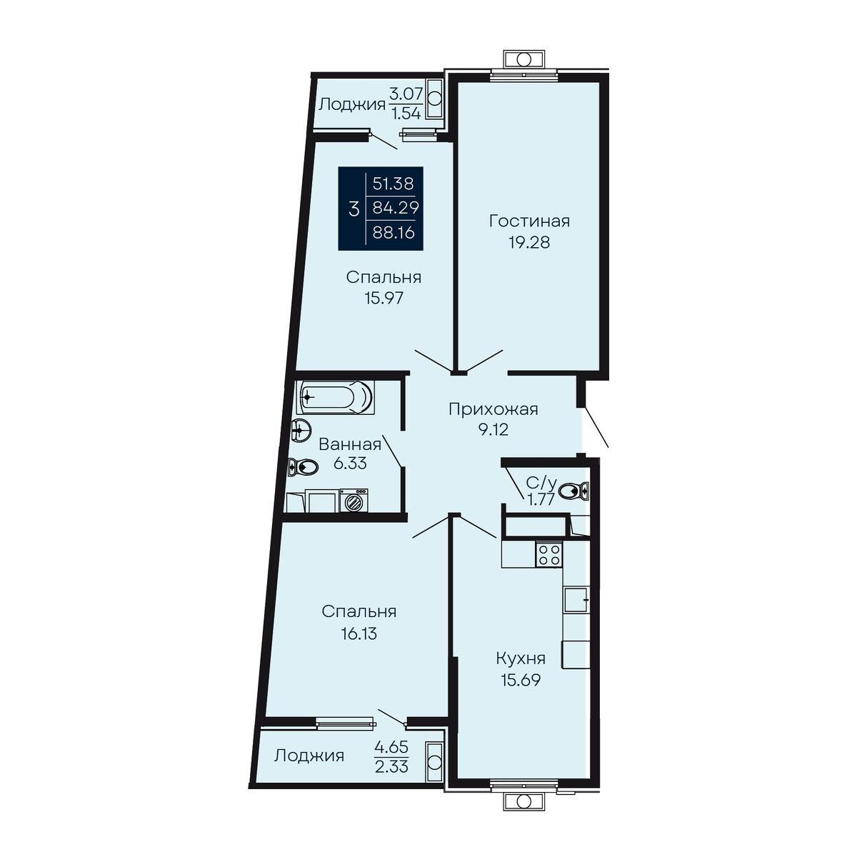 3-комнатная — 88,16 м² 12/14 эт. в Море
