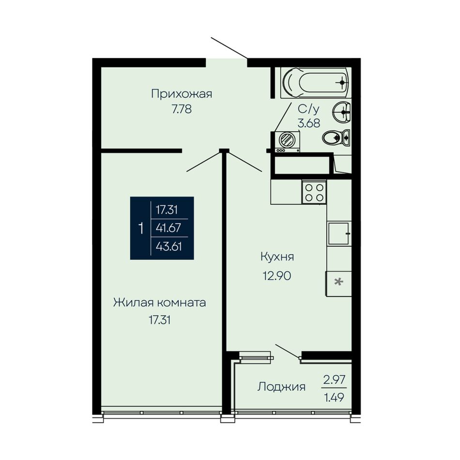 1-комнатная — 43,16 м² 1/14 эт. в Море