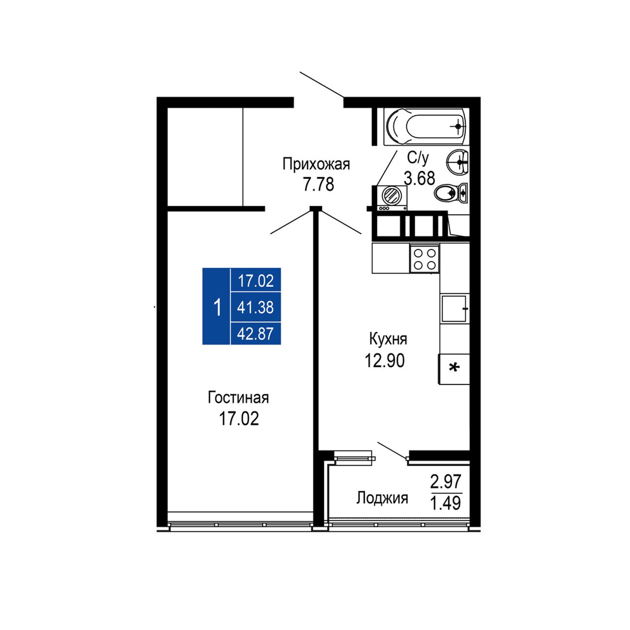 Общая площадь42,87 м²