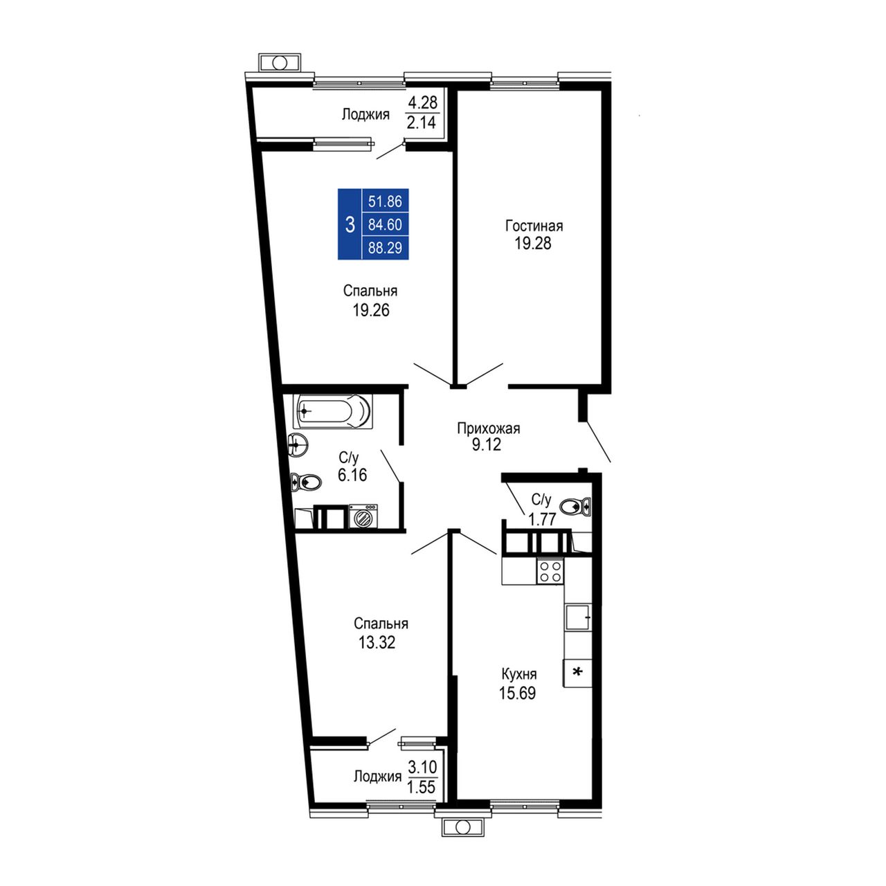 3-комнатная — 88,29 м² 1/14 эт. в Море