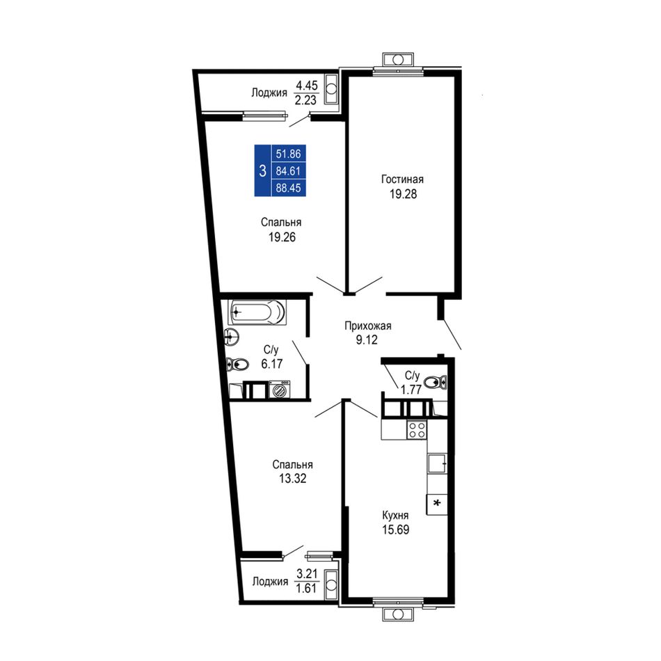 3-комнатная — 88,45 м² 5/14 эт. в Море