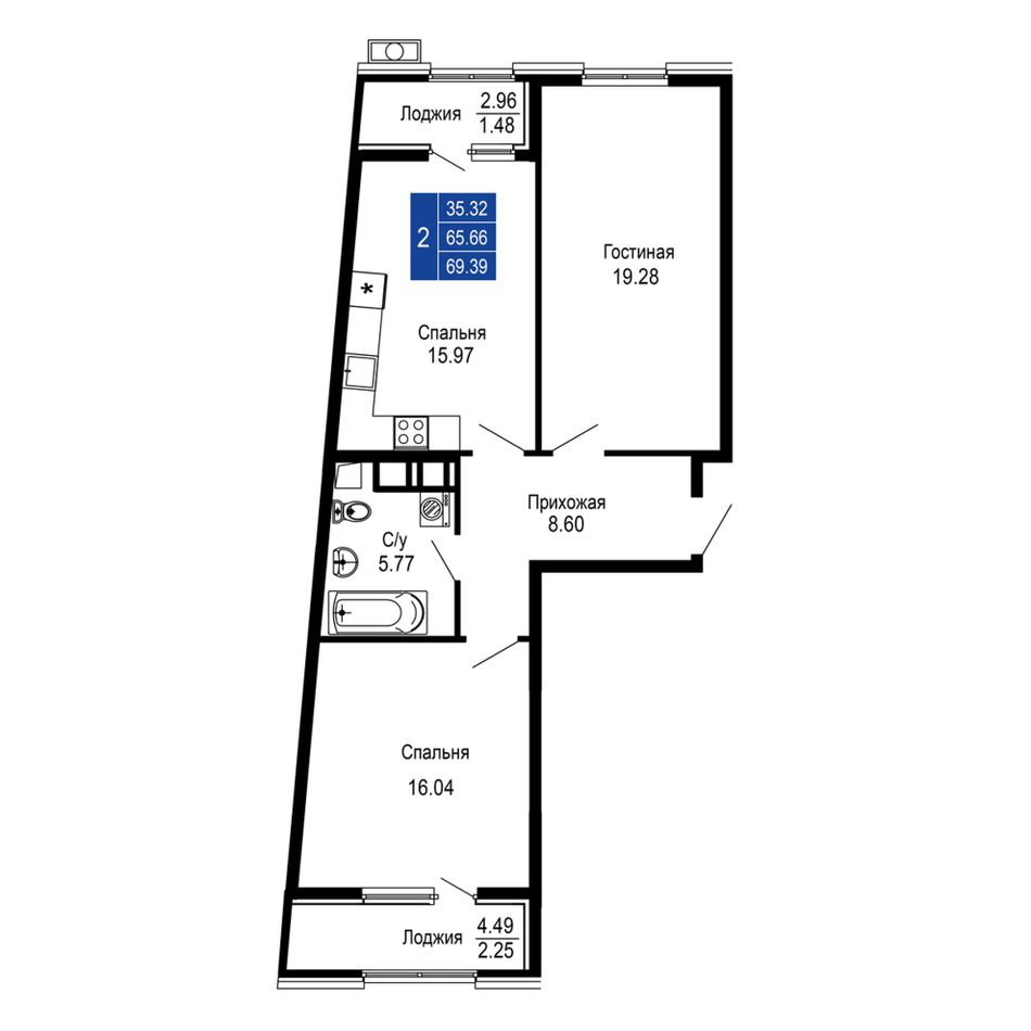 2-комнатная — 69,39 м² 2/14 эт. в Море