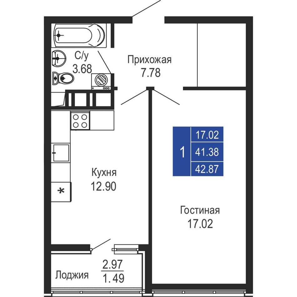 Общая площадь42,87 м²