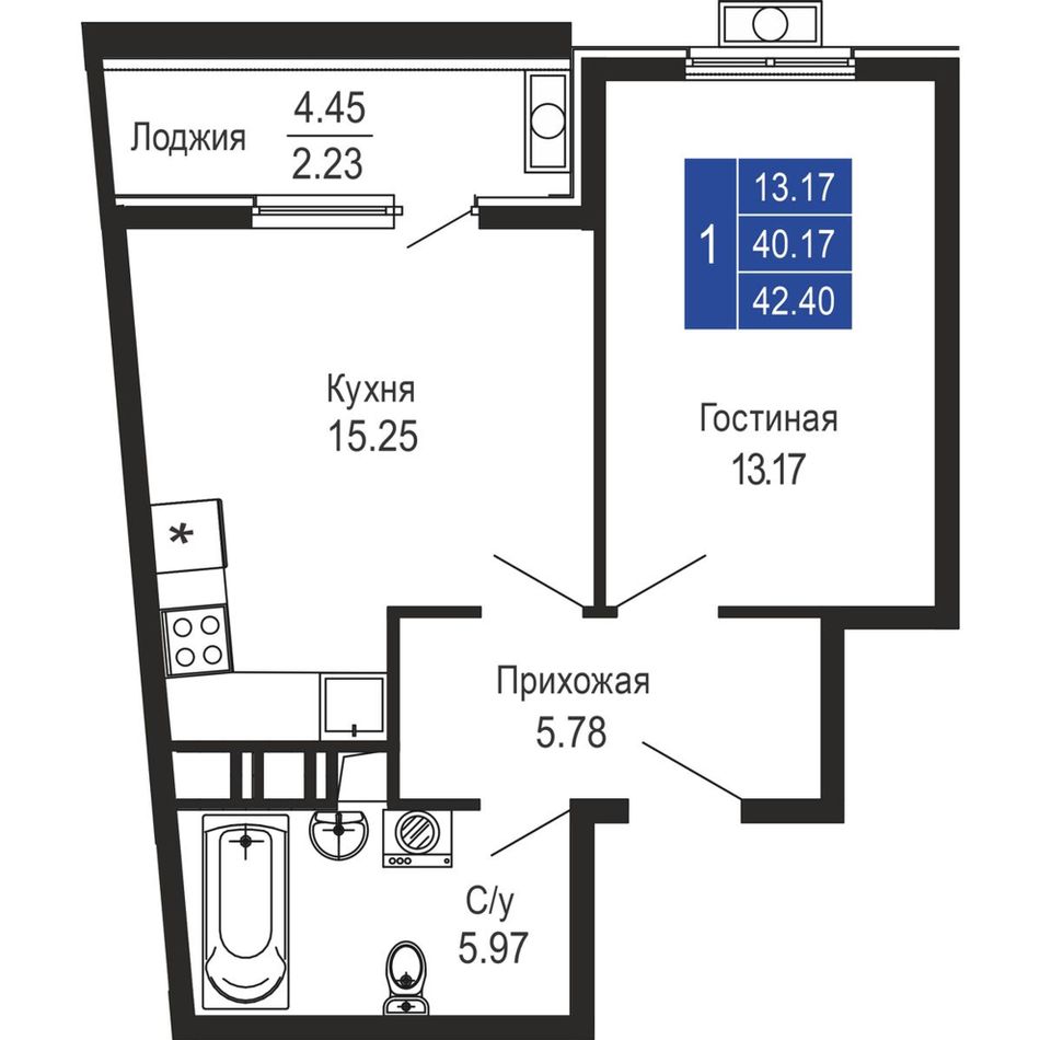 1-комнатная — 42,4 м² 3/14 эт. в Море