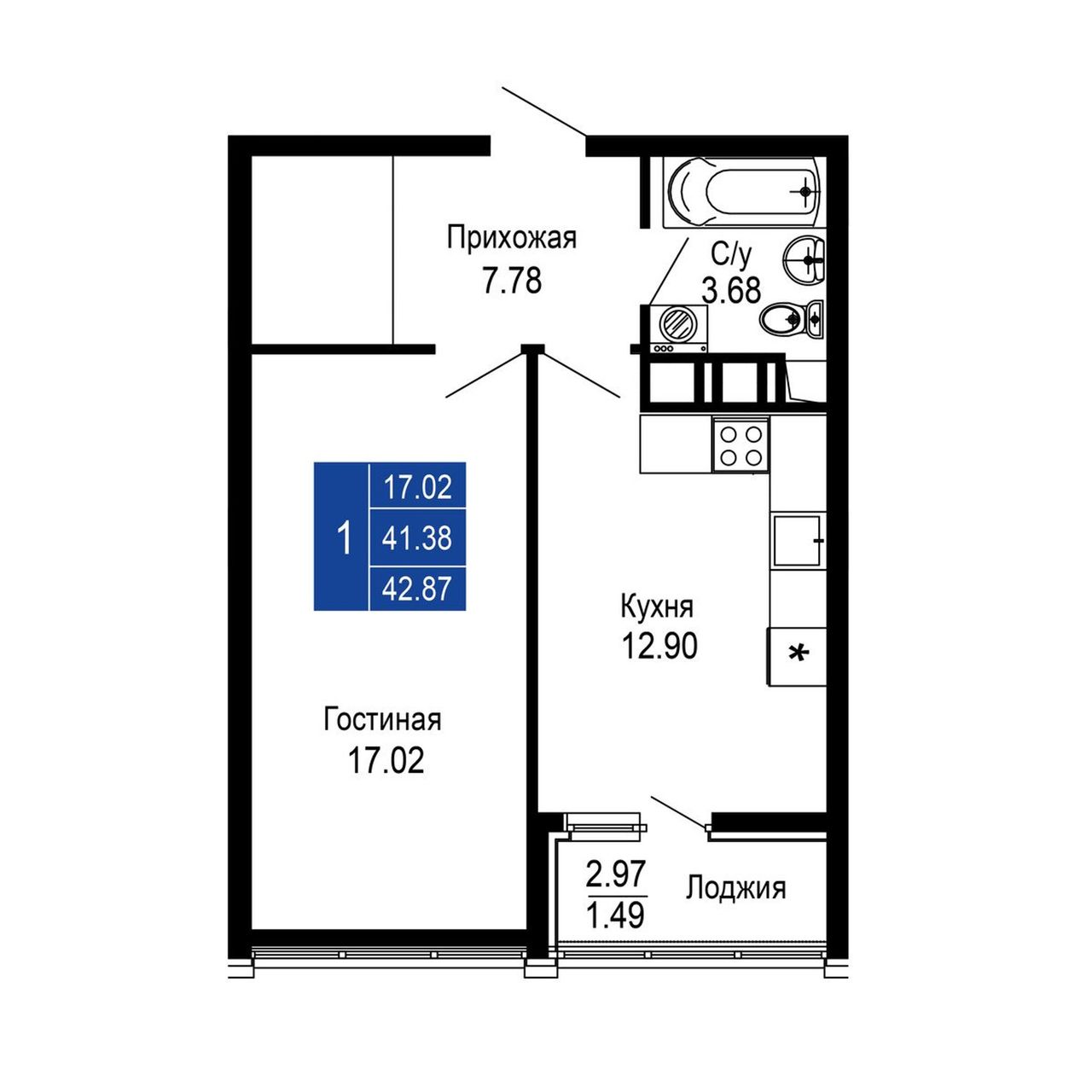 Общая площадь42,87 м²