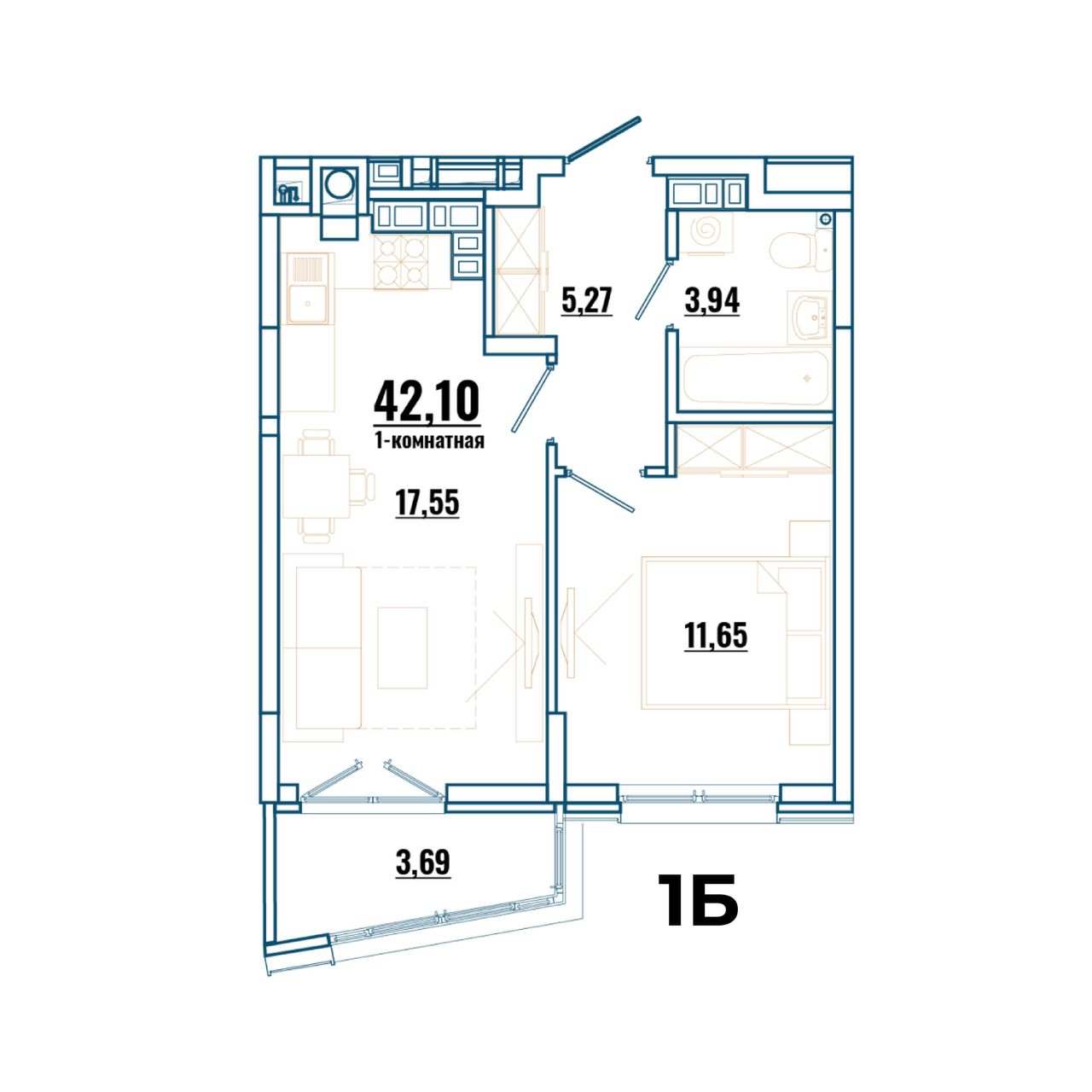 1-комнатная — 39,52 м² 1/4 эт. в Локация 9-11