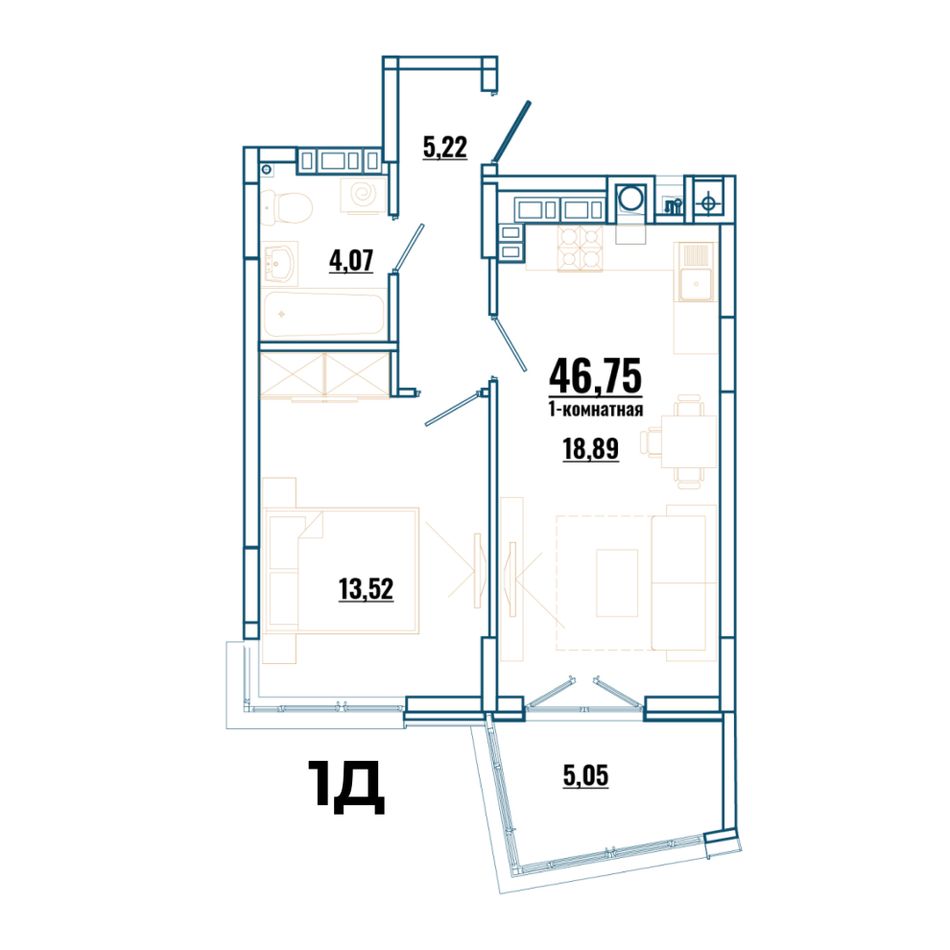 1-комнатная — 43,22 м² 3/4 эт. в Локация 9-11