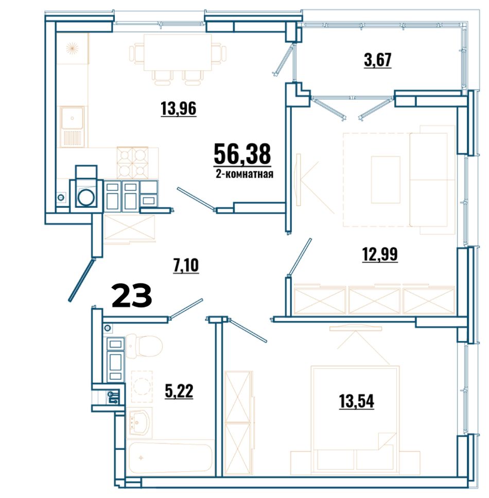2-комнатная — 54,55 м² 4/4 эт. в Локация 9-11