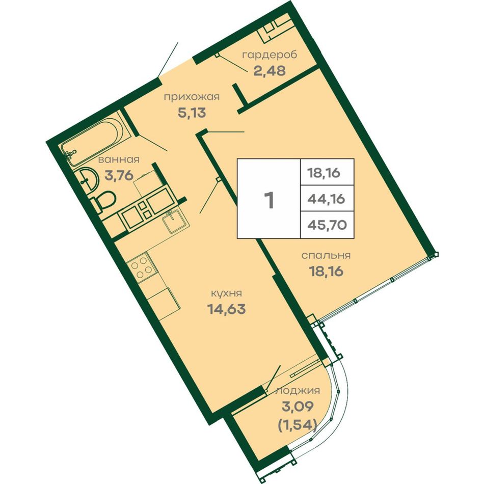 1-комнатная — 45,7 м² 3/17 эт. в СкайПАРК