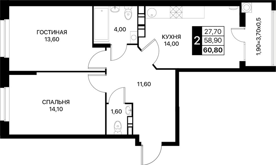 2-комнатная — 60,8 м² 4/20 эт. в Smartpolét (Смартполёт, Полет)