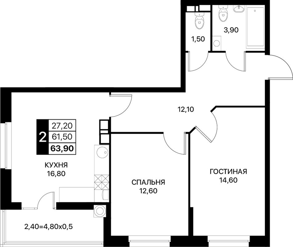 2-комнатная — 63,9 м² 12/20 эт. в Smartpolét (Смартполёт, Полет)