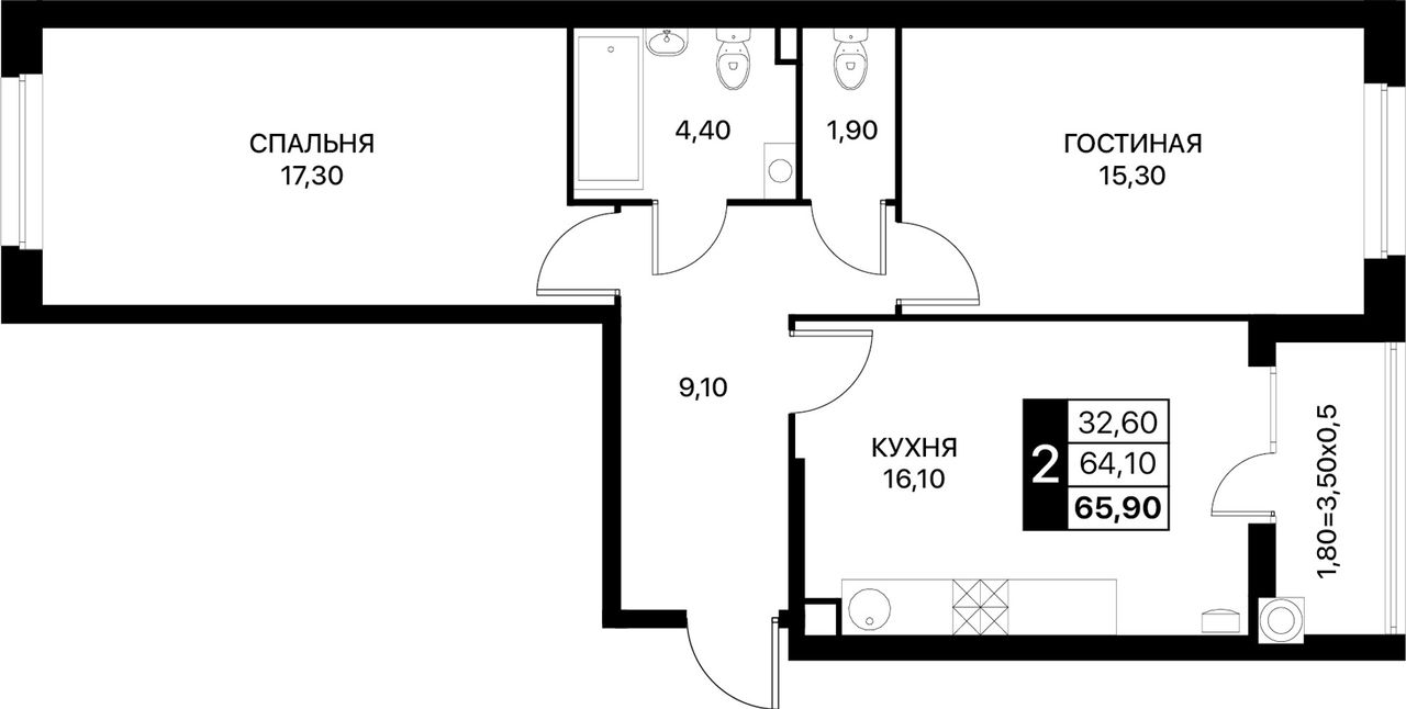 2-комнатная — 65,9 м² 2/20 эт. в Smartpolét (Смартполёт, Полет)